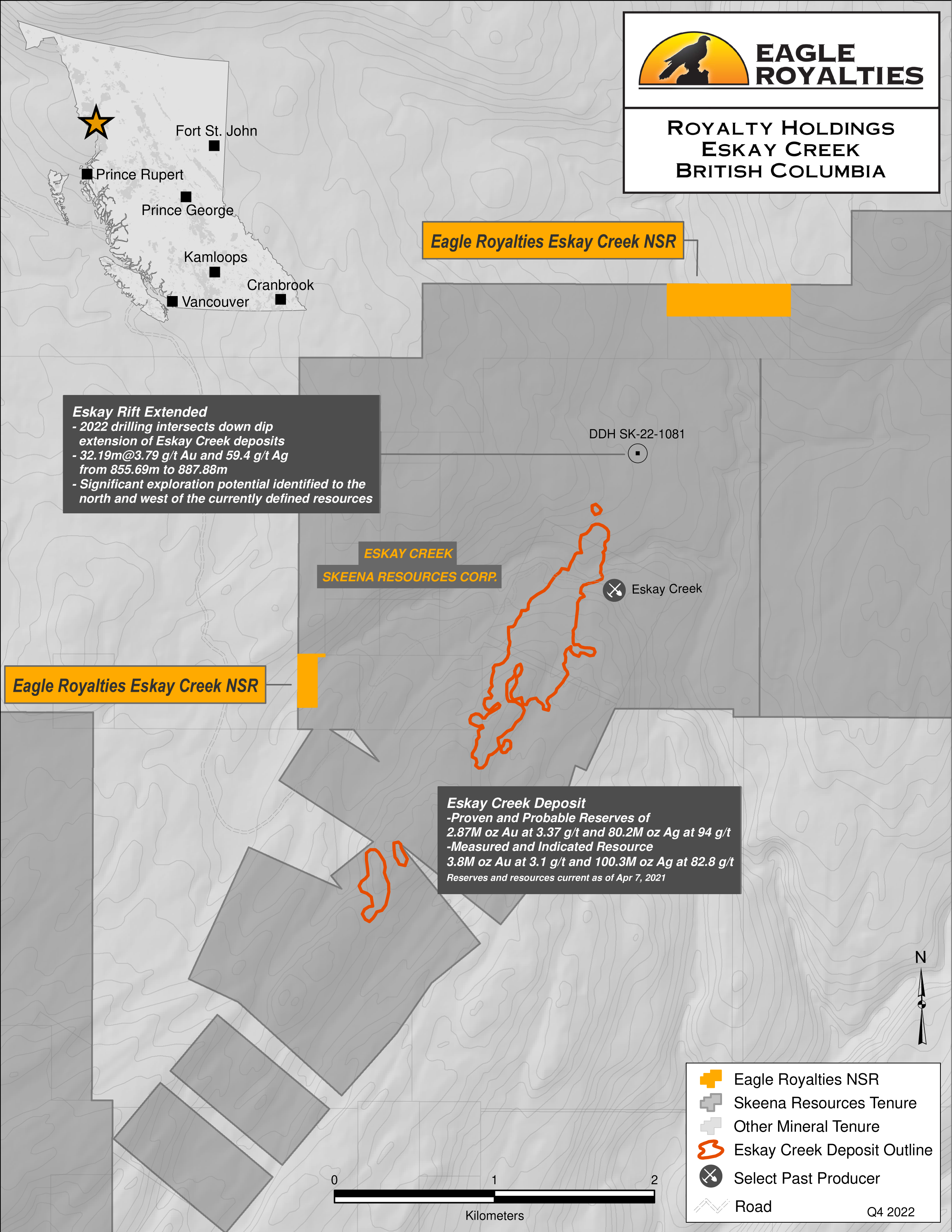 The Eskay Creek Royalty is located in two blocks near Skeena Resources Eskay Creek gold deposit. One block is located approx 1km west of the deposit while the other is located on strike and approximately 1.5km NE of the deposit.