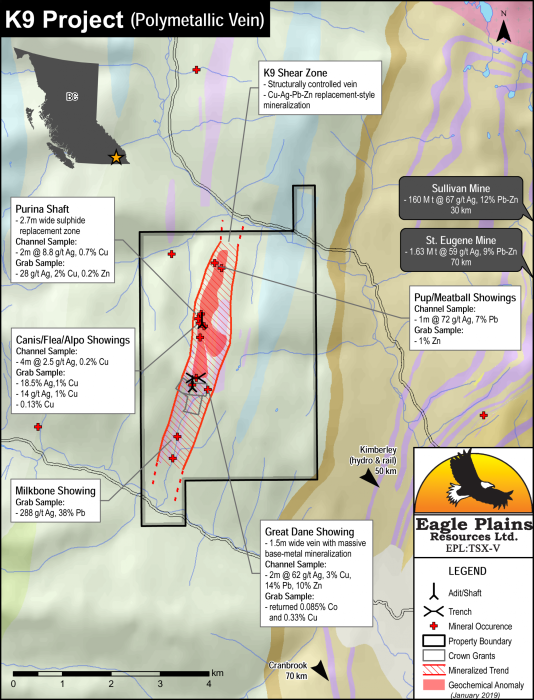 Image K9 Region British Columbia Owner/Optionee Eagle Plains Resources Commodity Silver Lead Zinc Copper Cobalt Royalty Terms 2% NSR, Buy-back 1% for $1m Area (ha) 1461 Project Status Exploration